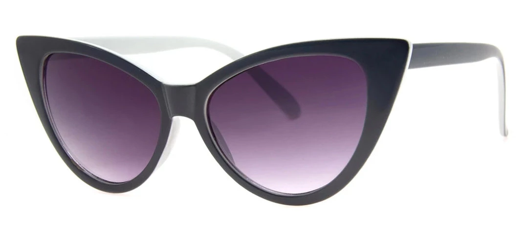 Ouch! – plastic cat eye sunglasses with arms that are dark gray on the outside and light gray on the inside and dark gray, almost black lenses.
