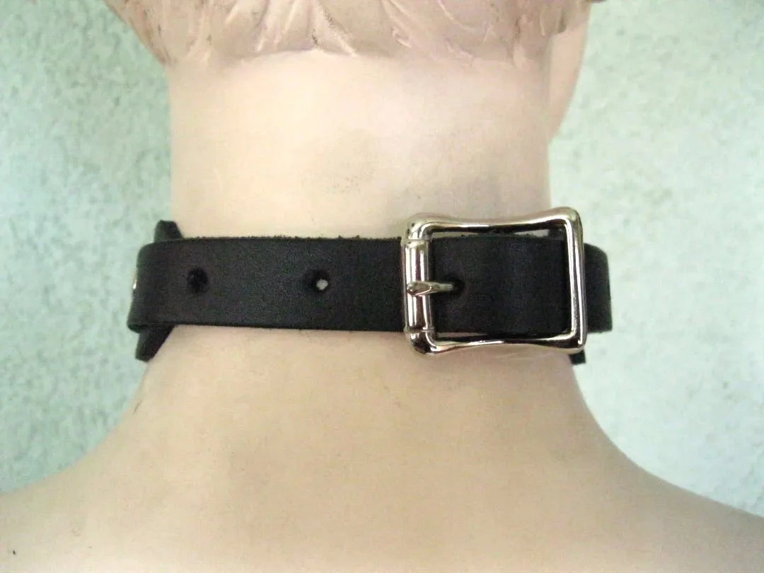 This is a nice bondage choker made of high quality leather. The choker is 3/4″ wide. The hardware is all bright nickle plated with a buckle closure. The heavy gauge O ring is 1″ .