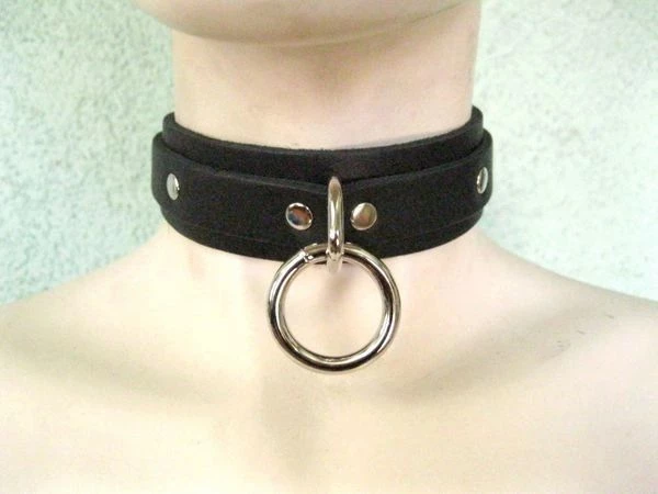 Bondage Choker with One Welded O Ring and D Ring. 1.25″ wide with buckle fastener.