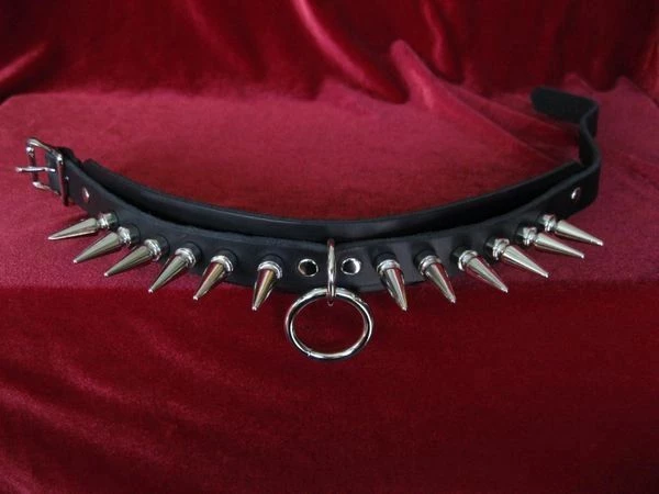High quality leather bondage choker 1.25″ wide with one 1″ 0 ring and 1 1/4″ long spikes.