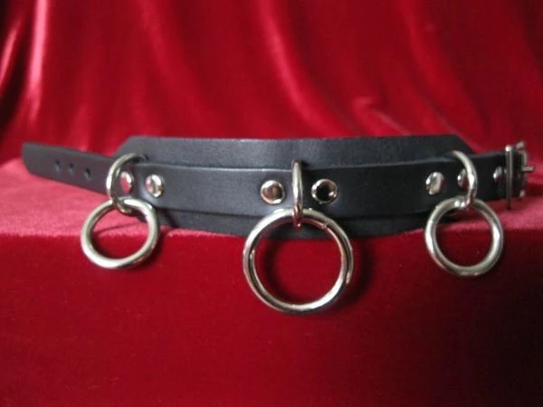 High quality 3-ring bondage wristband. The ring in the center is 1″ and the two on the side are .75″ Wristband is 1.25″ wide. 5/8″Buckle fastener with 3 adjustments at .5″ increments. Size shown is the middle hole of the three.