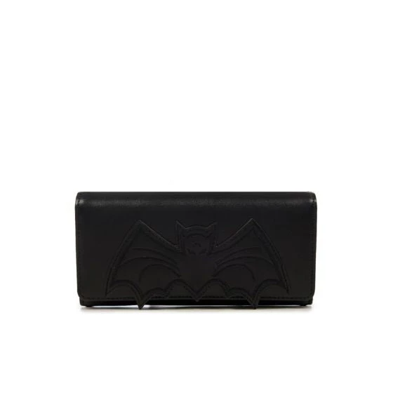 The black bat wallet features an embroidered bat on the outside with 12 card slots, an ID holder, a zipper change pocket and 4 large pockets.and a snap closure.
