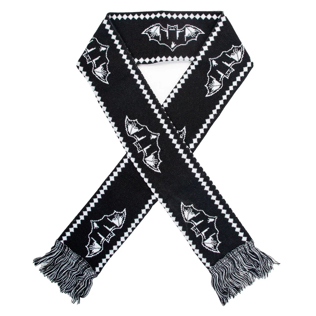 You are going to LOVE the new Nokturnal Bats scarf. Made of a soft jacquard knit featuring a repeat bat pattern and black and white fringe.