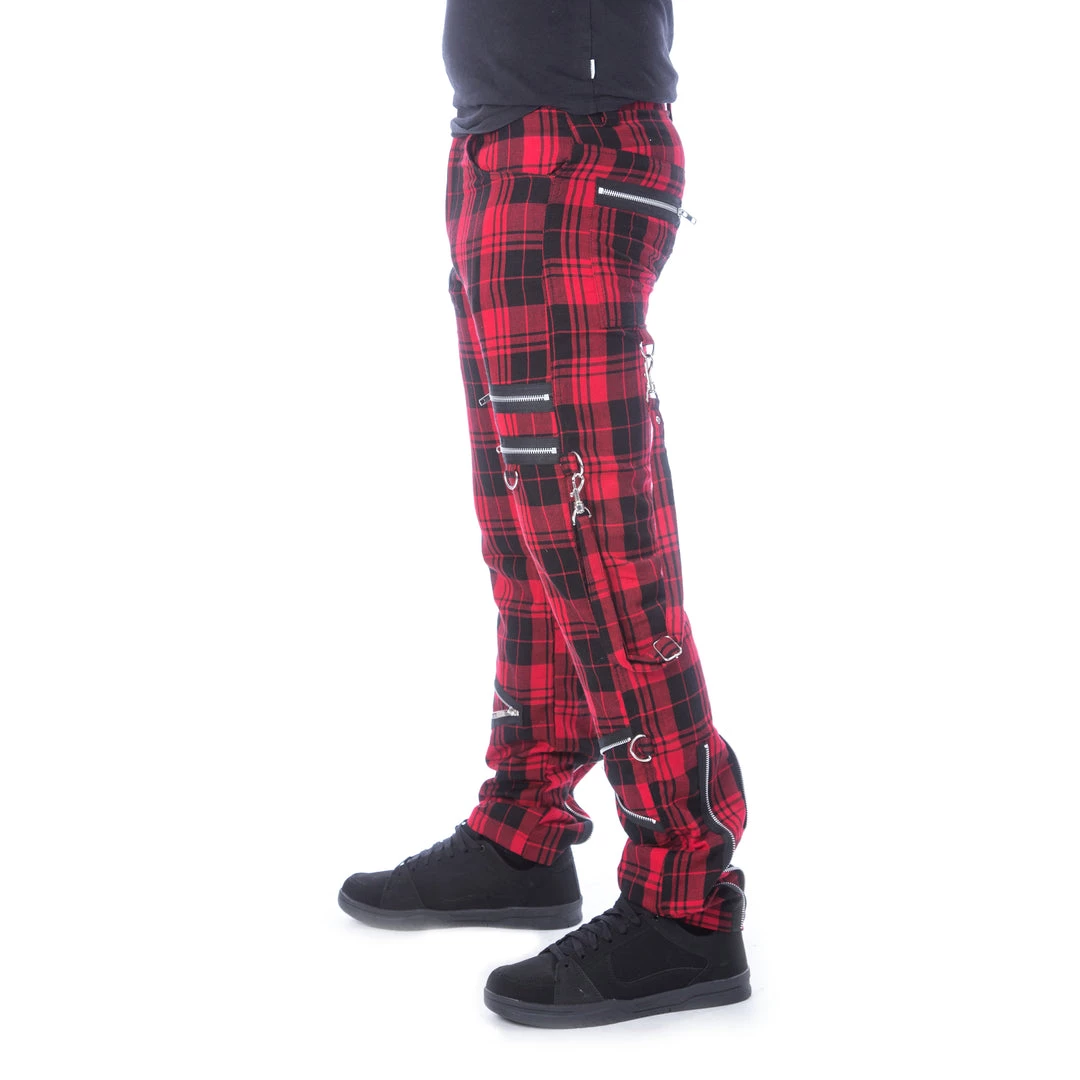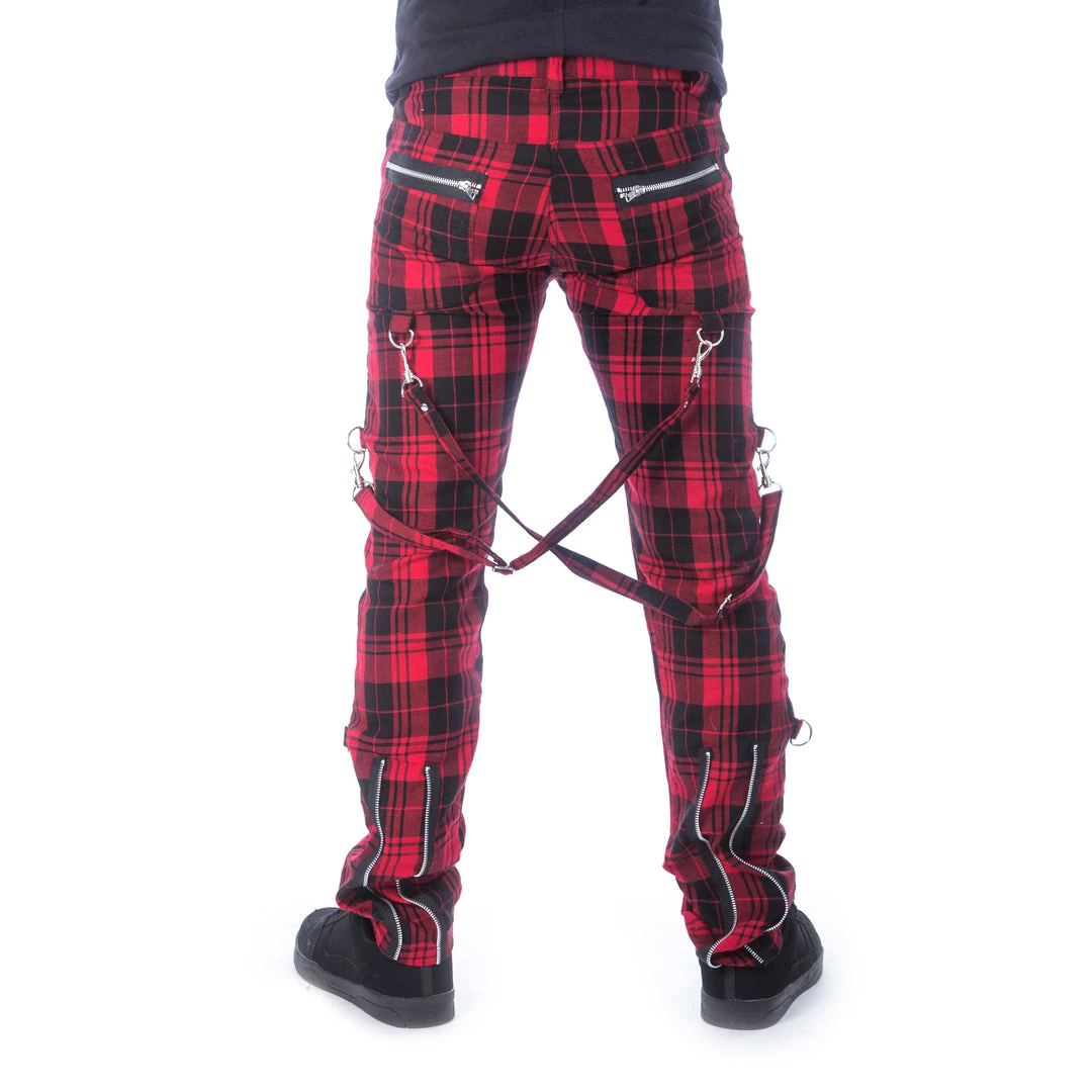 The Etienne Pants by Chemical Black are super-soft red tartan, slim fit pants for men with zipper accents,detachable bondage straps and D-rings.