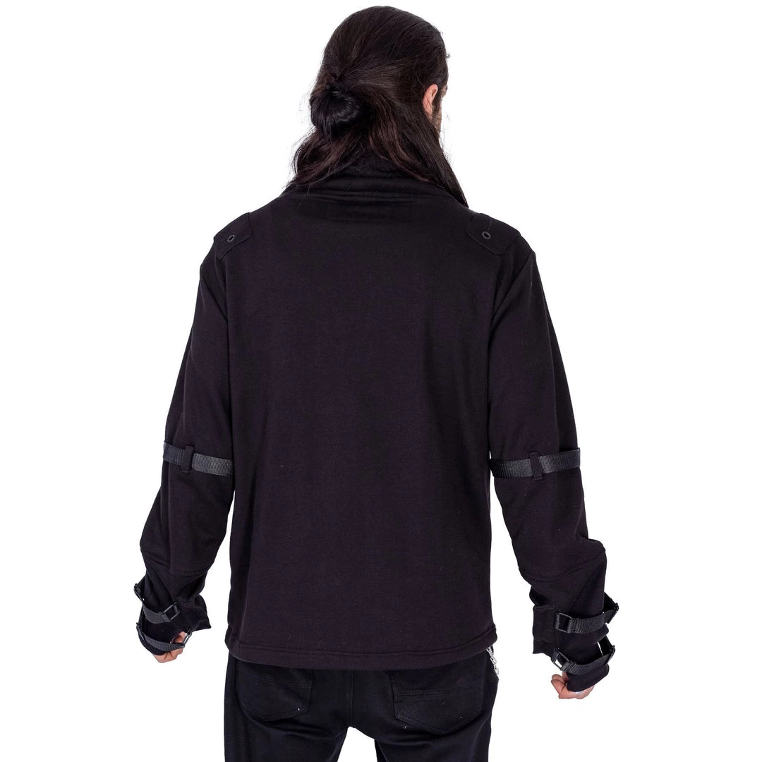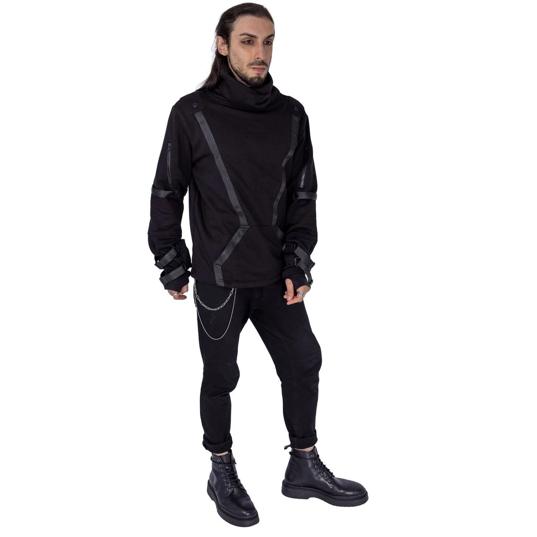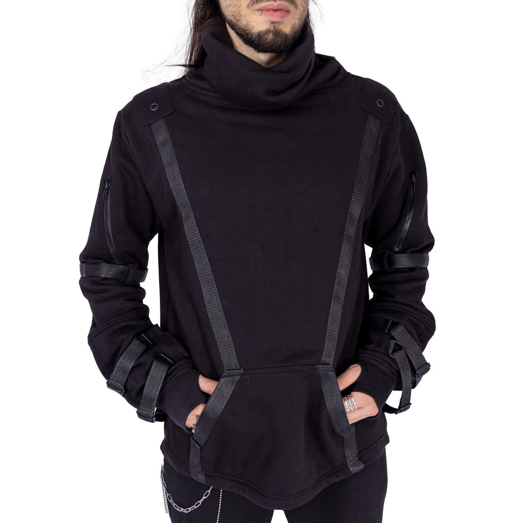 Black hooded pullover jumper with thumb holes, black straps, zipper accents and large, oversized collar.