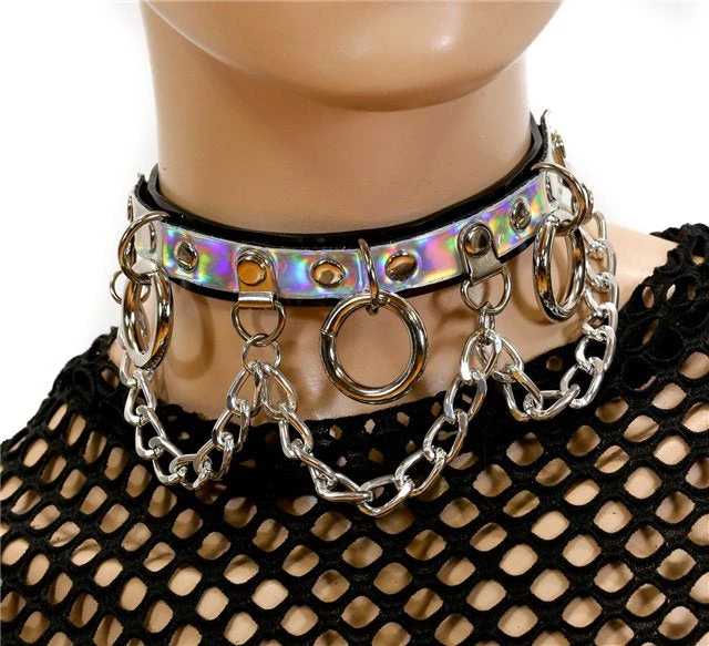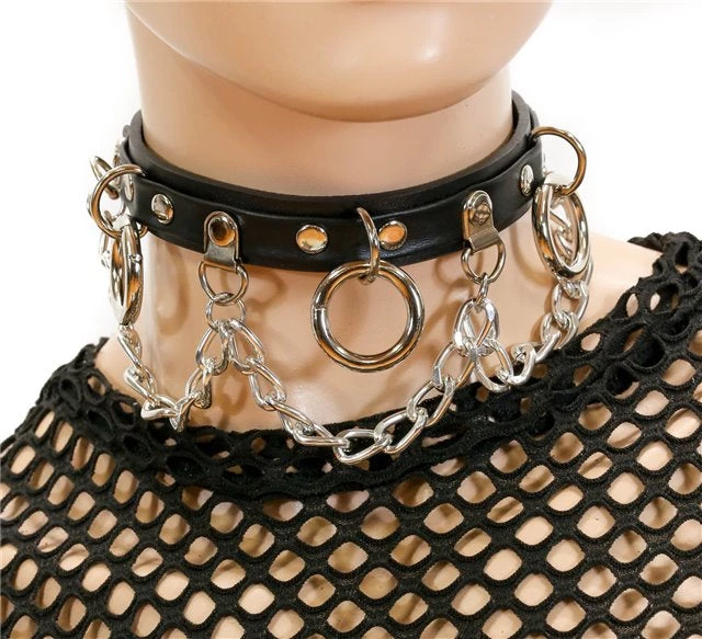 3/4″ Wide Leather Chocker with 1″ 3 Rings and Hanging Chains.