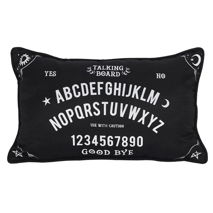 This lovely rectangular fabric cushion is black in color with a white ouija talking board design. Zip closure so inner can be removed.