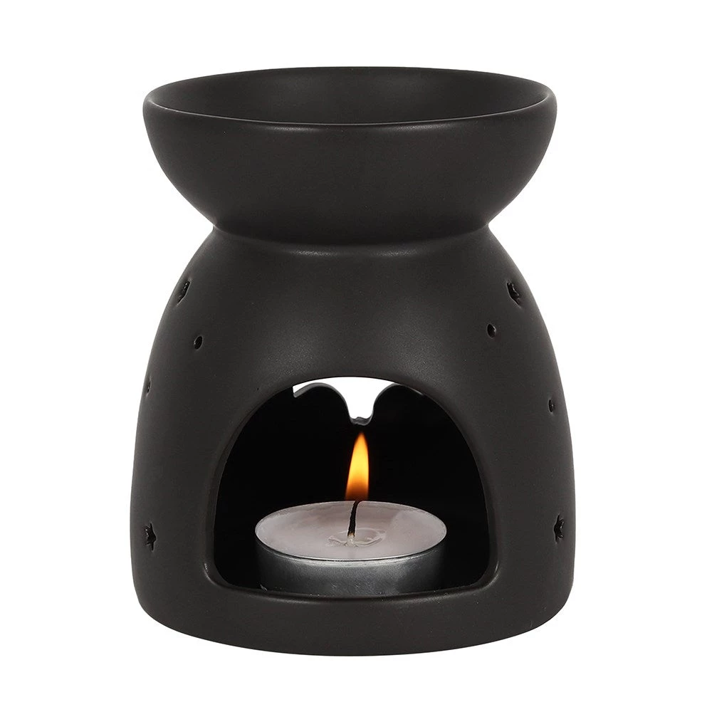 This black ceramic oil burner features a cutout bat design and a cool, matt finish. Compatible with both fragrance oil and wax and perfect for Halloween or spooky decor!