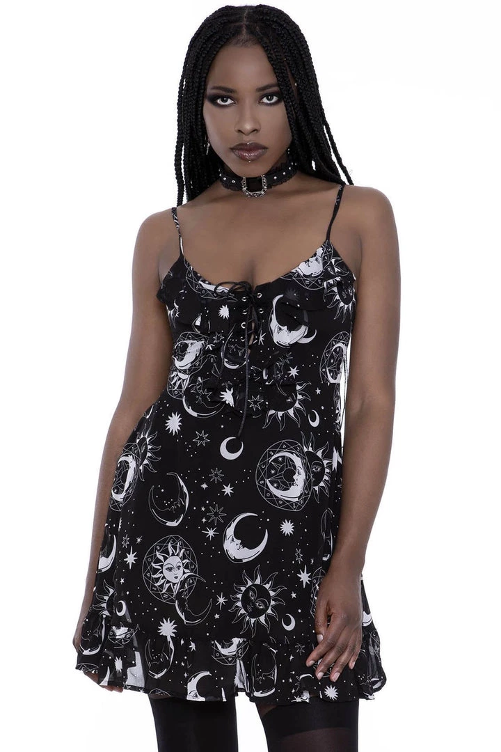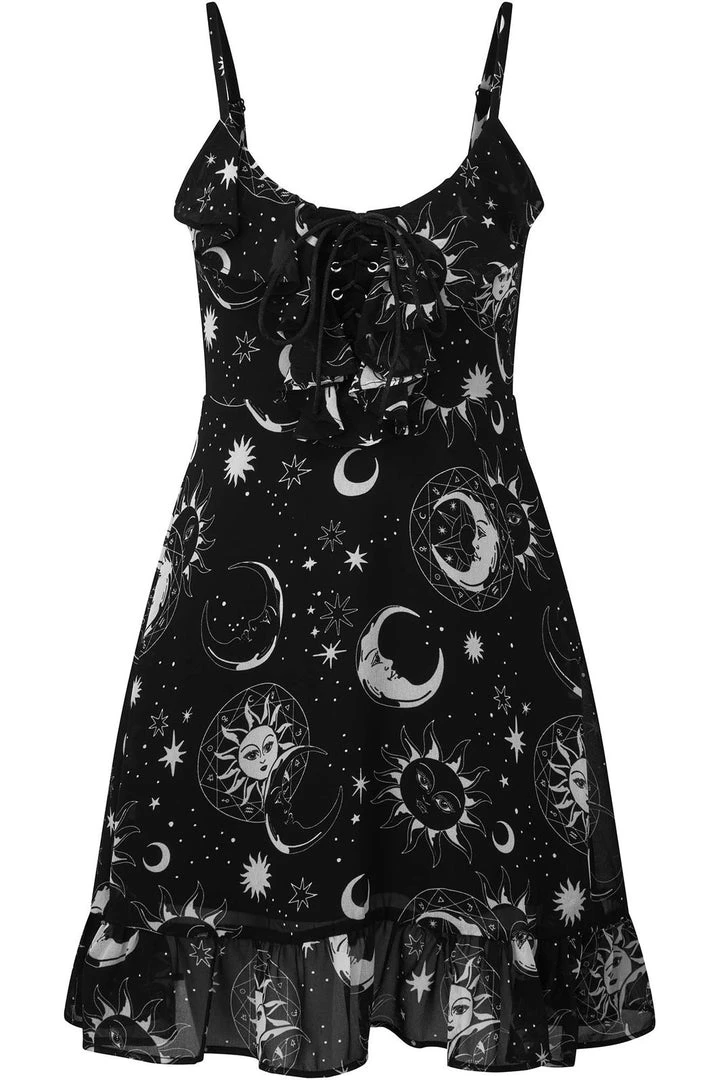 Dreamy and seductive, the ‘Astral Light’ sundress is your perfect partner for dusk or dawn. In a soft-flowy chiffon fabric for perfect comfort and fit. Featuring an open neck with thin shoulder straps, lace-up front detail and zipped back for easy on/off. Adorned with a contrasting sun & moon pattern. Versatile and easy to style – fully lined of course.