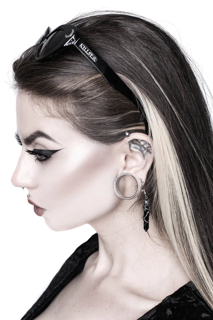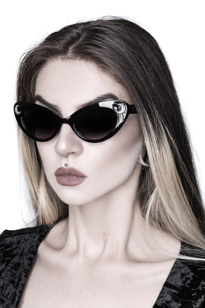 Add a touch of grunge; the ‘Cosmic Shade’ sunglasses are channeling some babe vibes whilst keeping it dark – seriously oversized and with clean slick lines. Black custom frames + dark tinted lenses and silver hardware detail of crescent moons. UV protection.