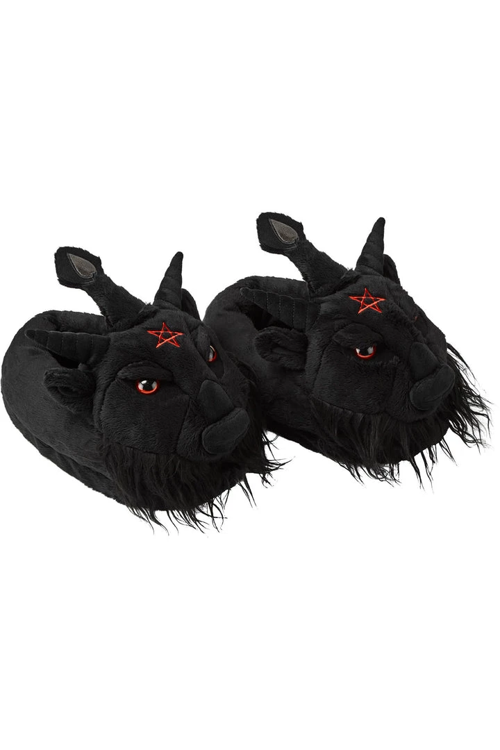 Feel the chill of hell freezing over? Keep yer paws cozy with our ‘Dark Lord’ Baphomet slippers. In a soft fleece material, closed foot styling with a goat-head statement to the front, 3D ears + horns, embroidered pentagram, and fur detailing. Purrfect for when you need to take some time to relax and chill with yer demons.