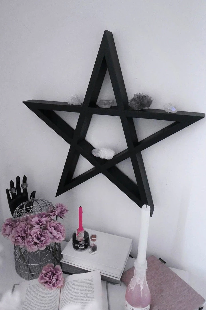 Practical and stylish wooden pentagram shelf, all black to match yer soul. Perfect for storing your magical objects, crystals, candles or simply just decorate your wall.