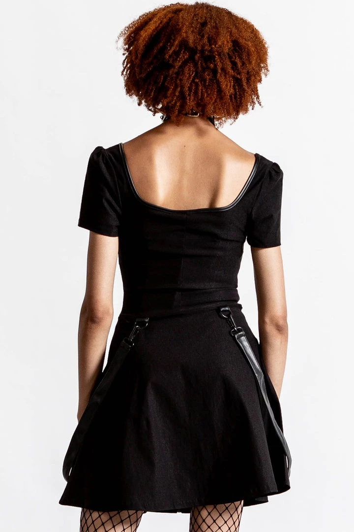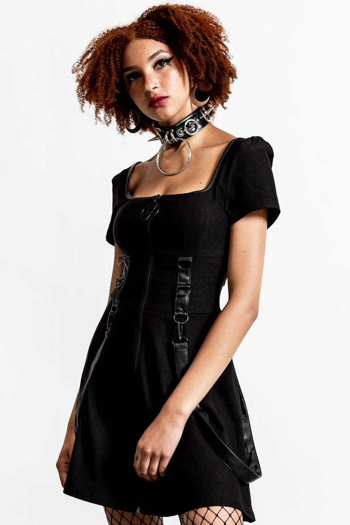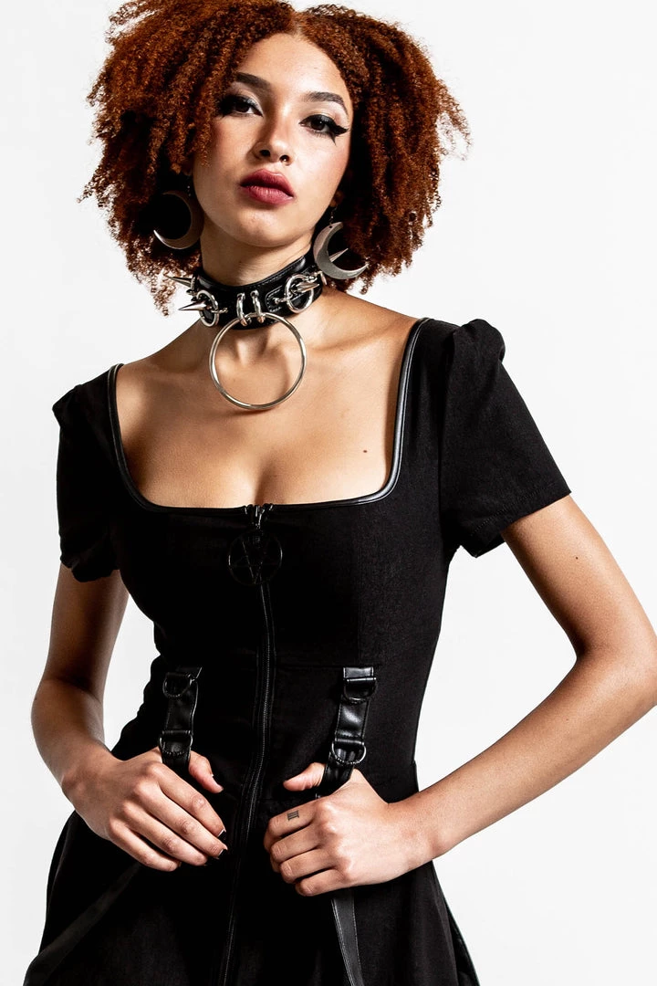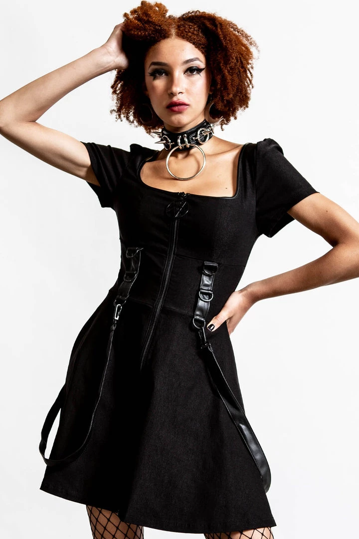 Cause a storm in our ‘Grave Rebellion’ dress. Conjured from super soft and stretchy material to ensure it hugs you in all the right places! Features a pentagram pull, statement zip down the front, cap sleeves and detachable straps. This angsty statement piece is a must-have in any gothic wardrobe!