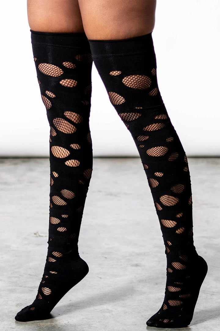 When all else fails, get new socks! Classic and exxxtra long socks – ‘Wretched Soul’ distress socks featuring an all-black fabric and thigh-high look. With distressed details all over.