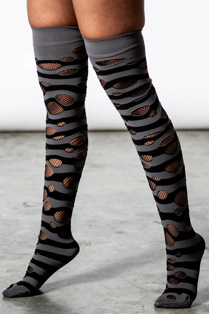 When all else fails, get new socks! Classic and exxxtra long socks – ‘Wretched Soul’ distress socks featuring contrast stripes and thigh-high look. With distressed details all over.