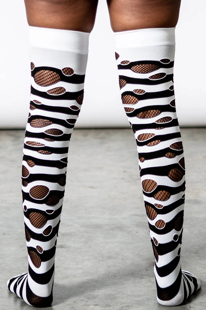 When all else fails, get new socks! Classic and exxxtra long socks – ‘Wretched Soul’ distress socks featuring contrast stripes and thigh-high look. With distressed details all over.