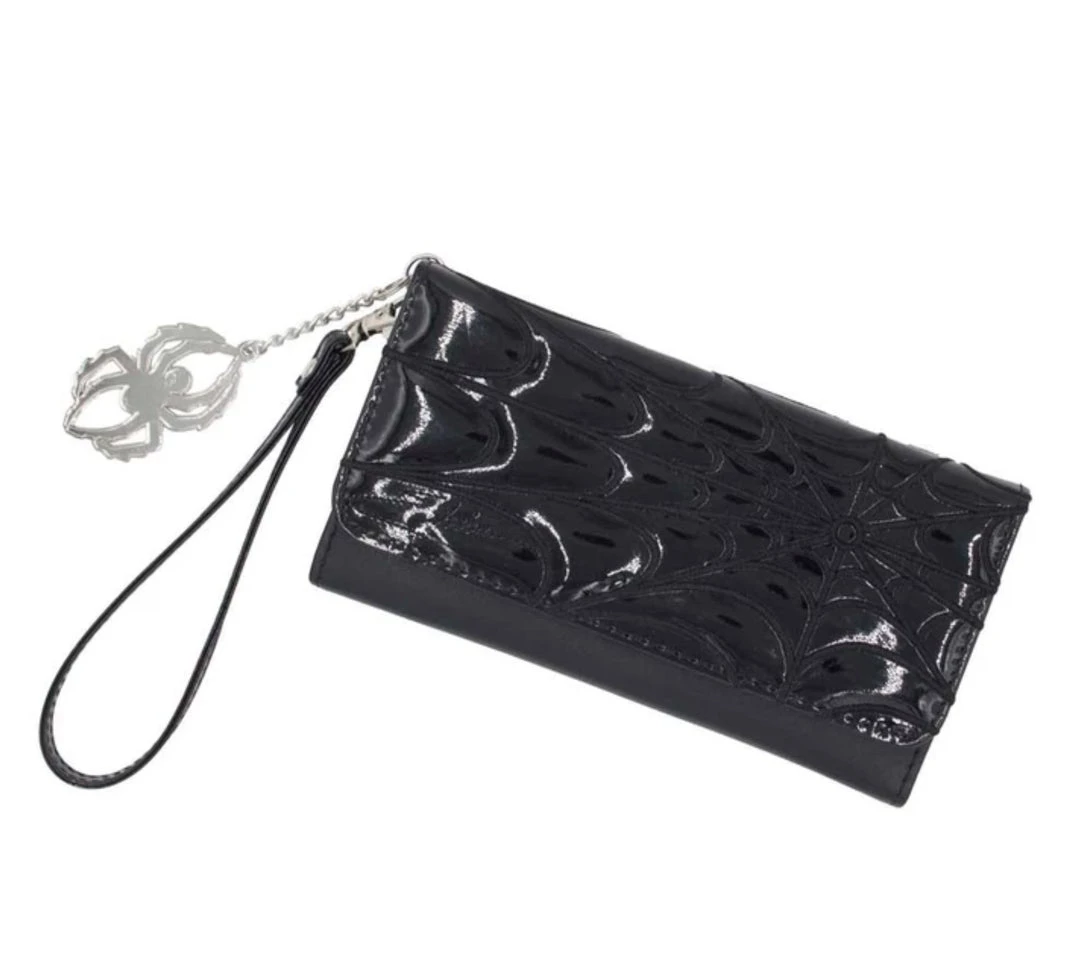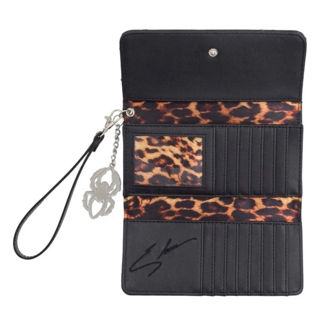 Get caught in Elvira’s web with this officially licensed Elvira Macabre Mobile Black Edition Wallet. Wallet features an embroidered black web design on black vinyl. It has 3 inside sections, an ID holder, 14 card spaces, a coin section in the back, a detachable spider chain, a wristlet and a double snap closure to widen space if needed.