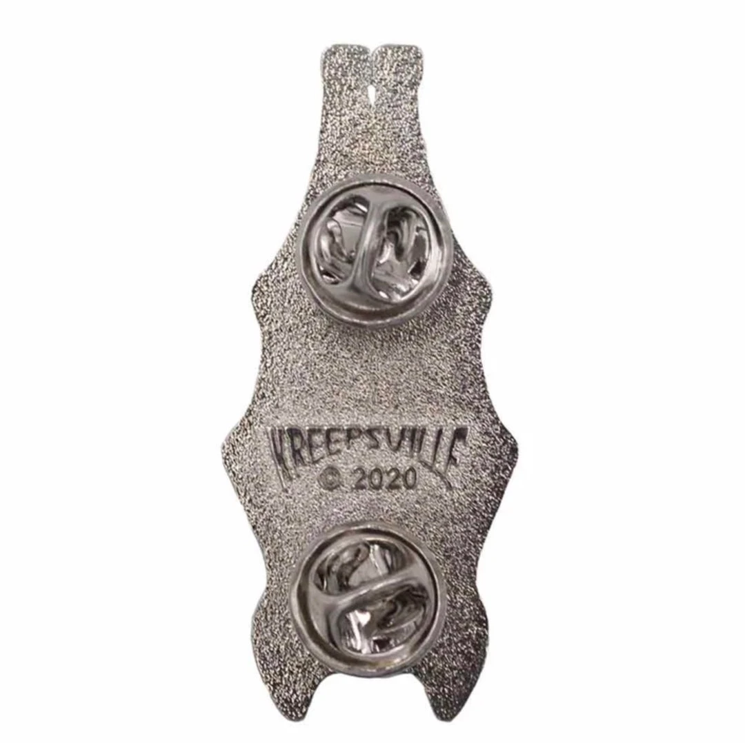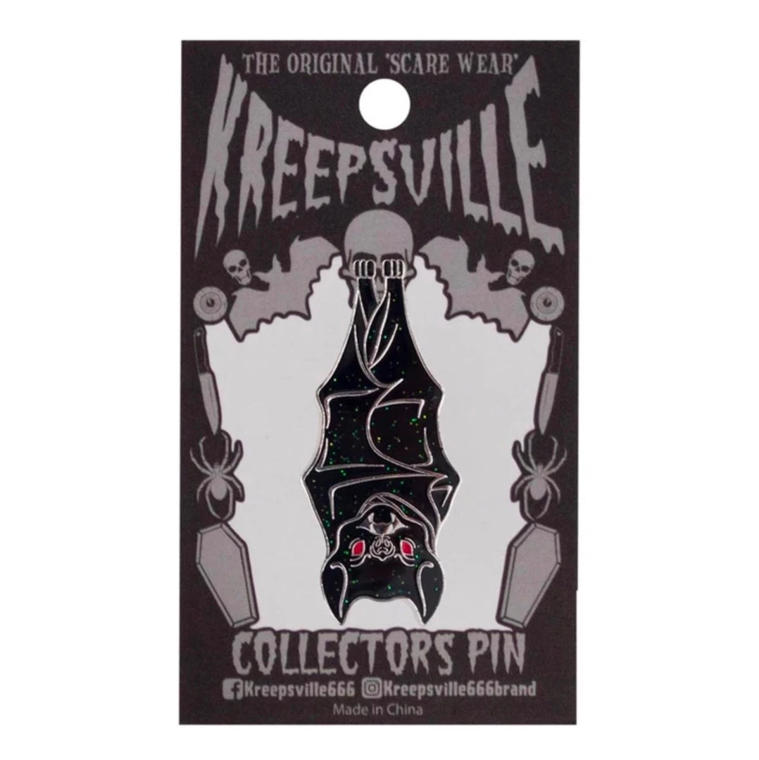 Kreepsville 666 Hanging Bat Glitter Enamel Pin, gloss finish with multi color glitter.