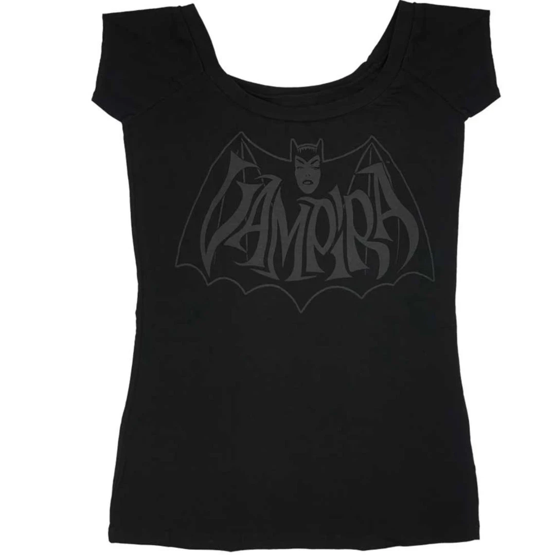 Quickly to the bat-hearse! This officially licensed Vampira shoulder tee features a dark grey Vampira retro bat print.