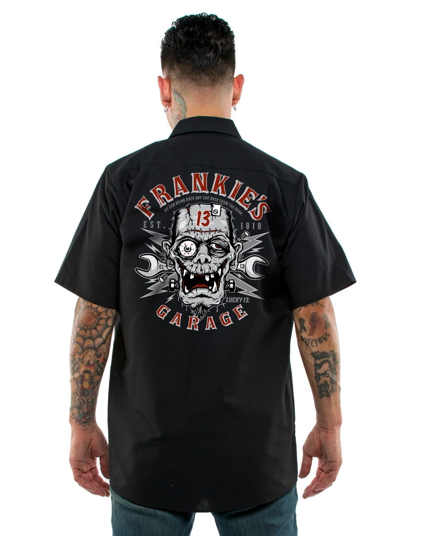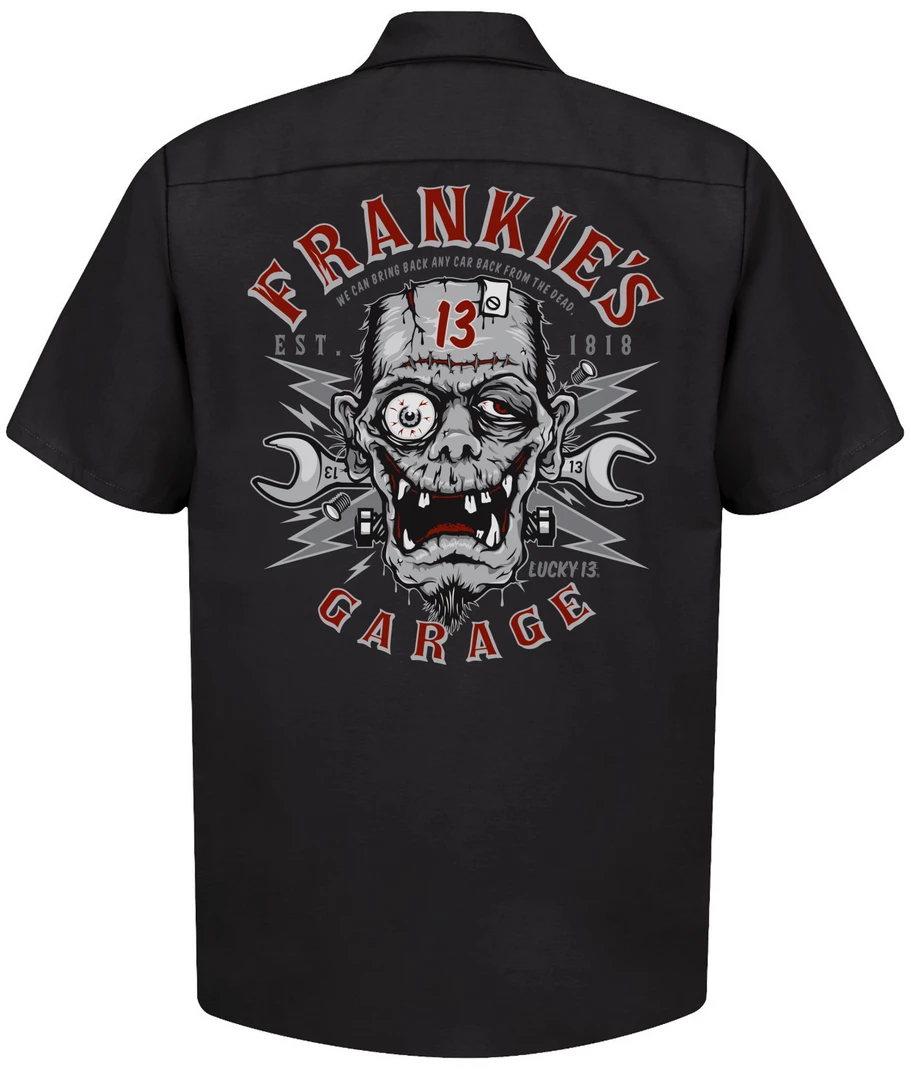 The FRANKIE’S GARAGE Men’s short sleeve work shirt is a cotton/poly blend fabric with Touchtex technology, which has superior color retention, soil resistance, durable press and wick-ability. It has a two-piece lined collar with sewn-in stays, six button front with gripper at the neck. Two button-through, hex-style pockets with a “Lucky 13” embroidery above the left one. The back is printed with the “Frankie’s Garage” vintage style chop shop graphic.