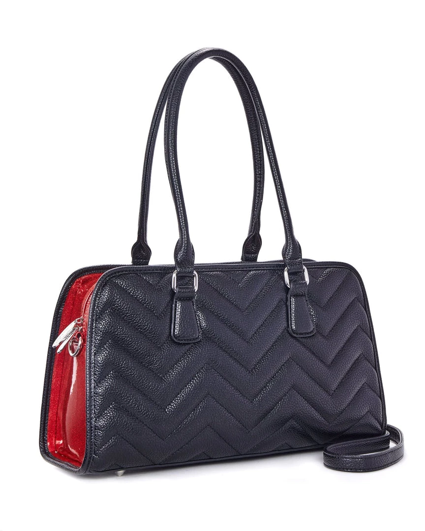 Our new Hellraiser Totes are deliciously dark. They feature our all over chevron stitching and our skull and chevron hardware. Inside is lined with black on black leopard with a zipper closure pocket and silver bullet feet on the bottom. Also comes with a detachable and adjustable crossbody strap. These are large enough to carry all your gothic goodies for day and night.
