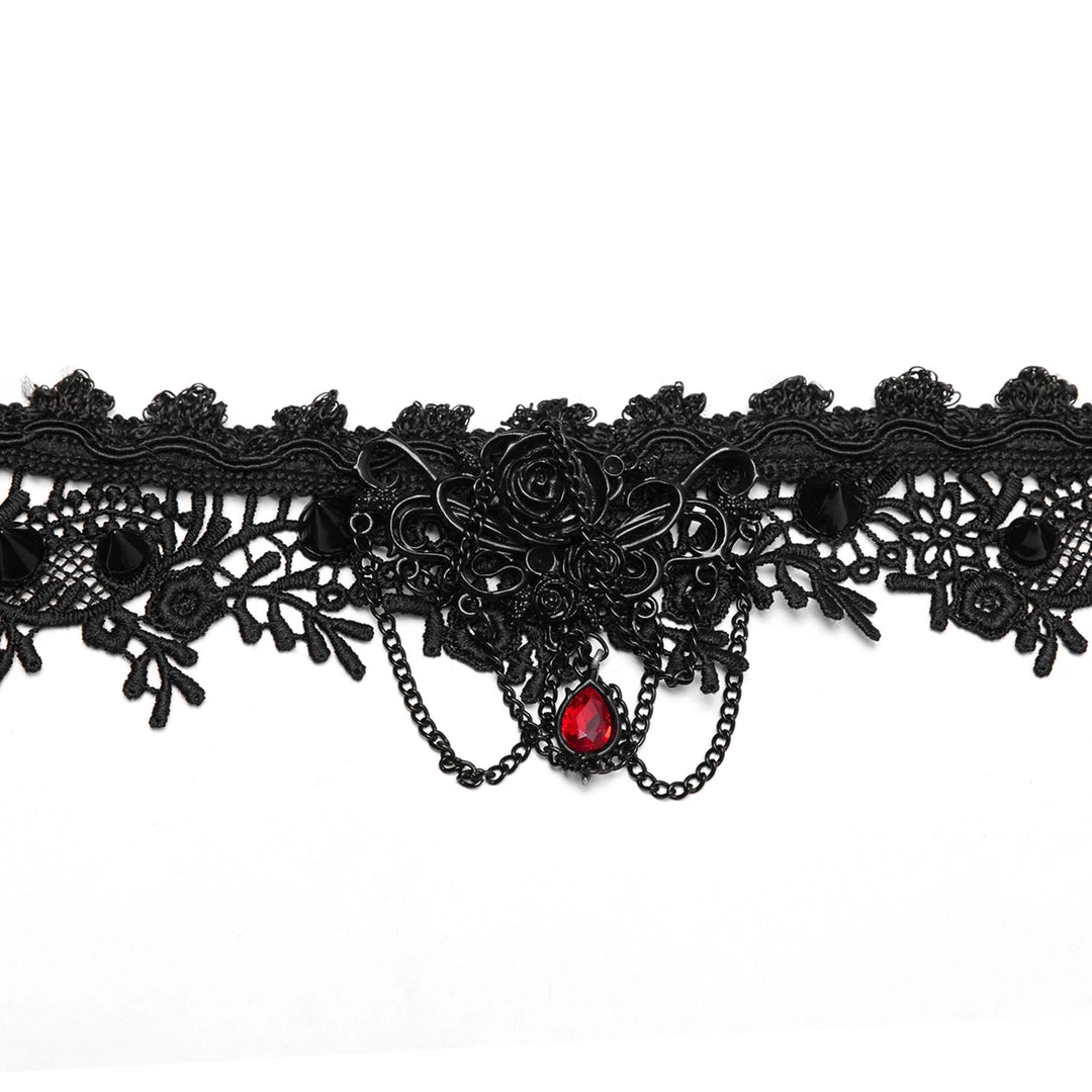 Gorgeous black lace choker with rose, spikes, delicate metal chains & red stone brooch on the center & adjustable fastener on the back.