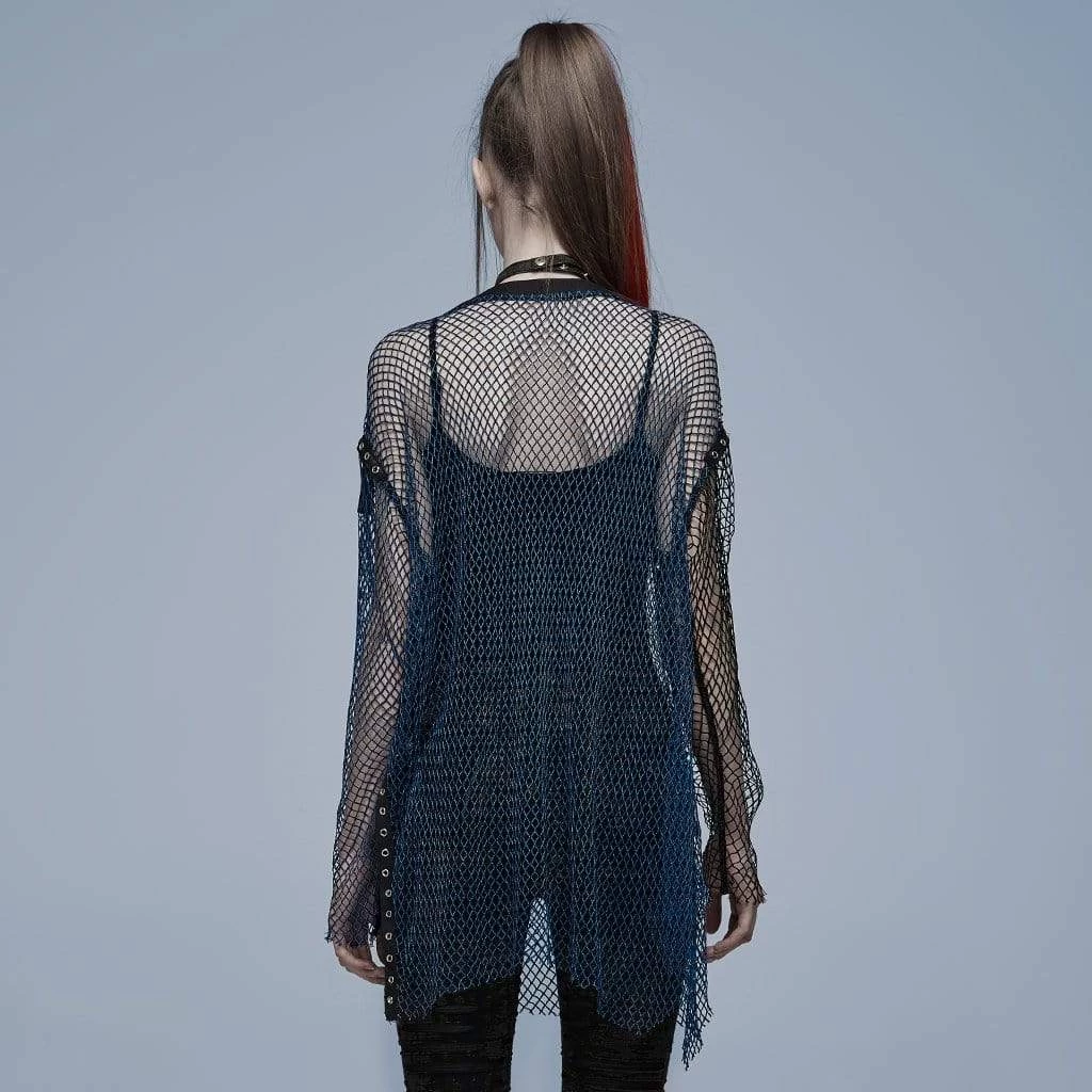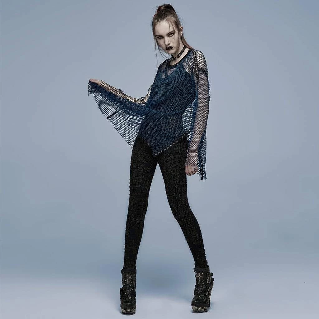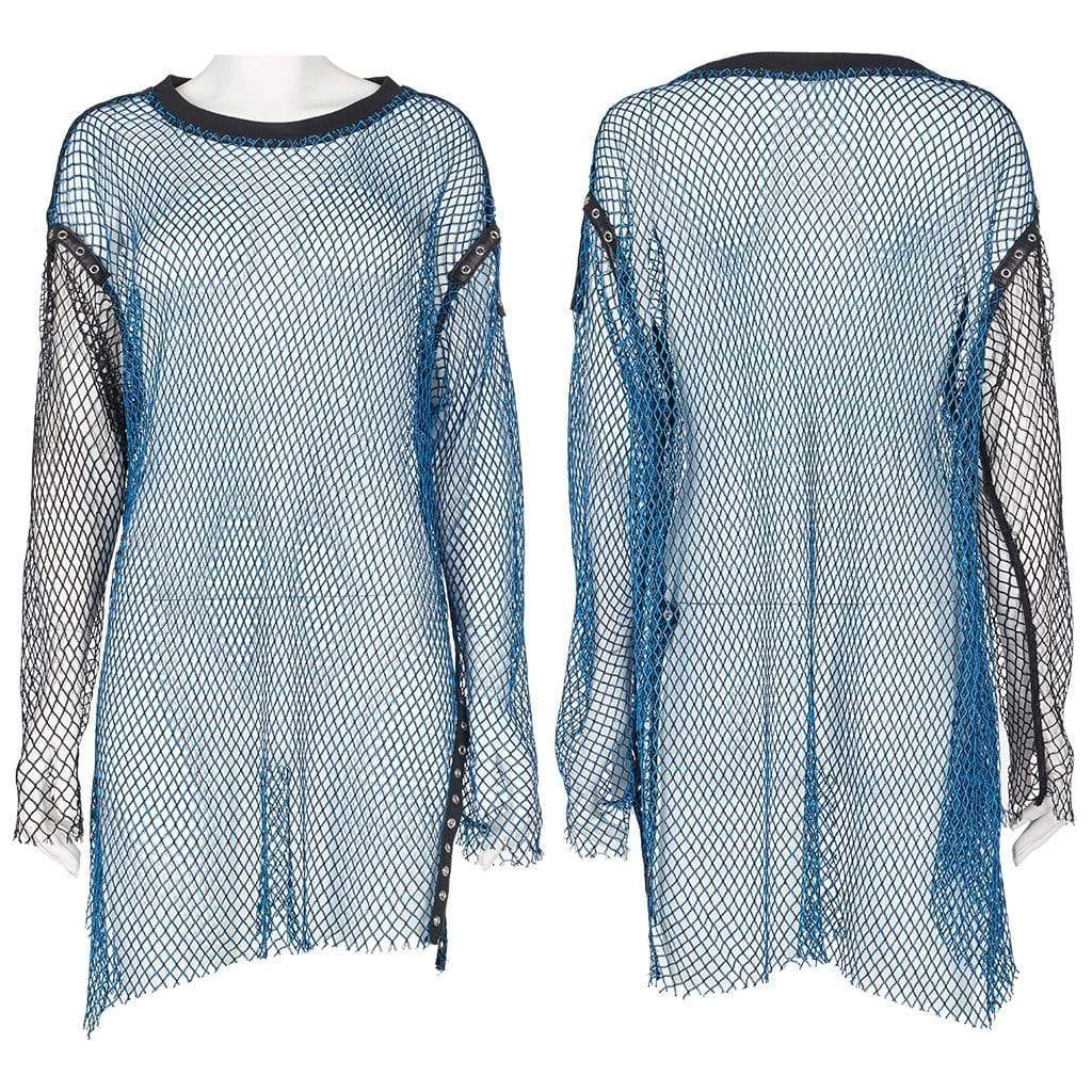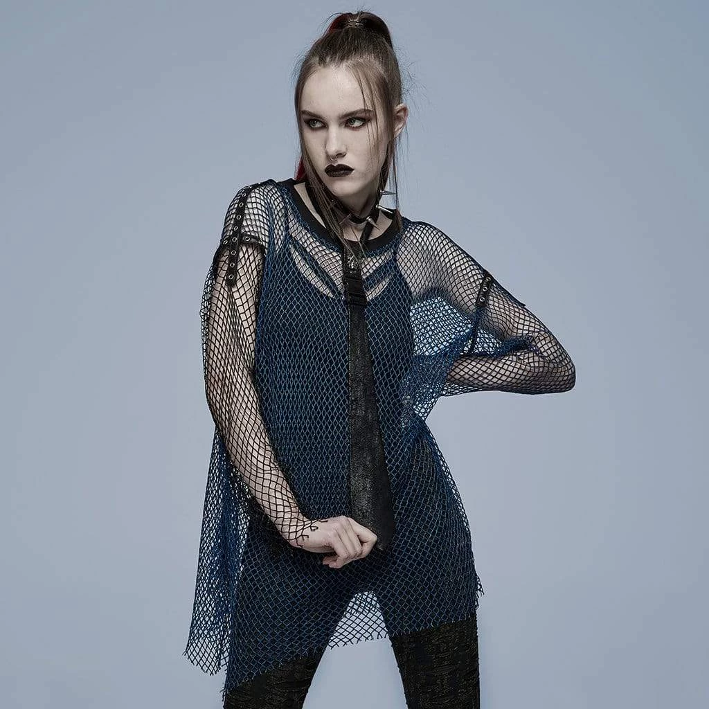 Black and blue, oversized, long sleeve mesh top with vegan leather straps stitch tot he shoulders and sleeves.