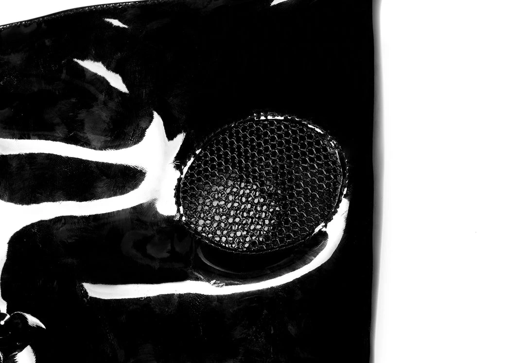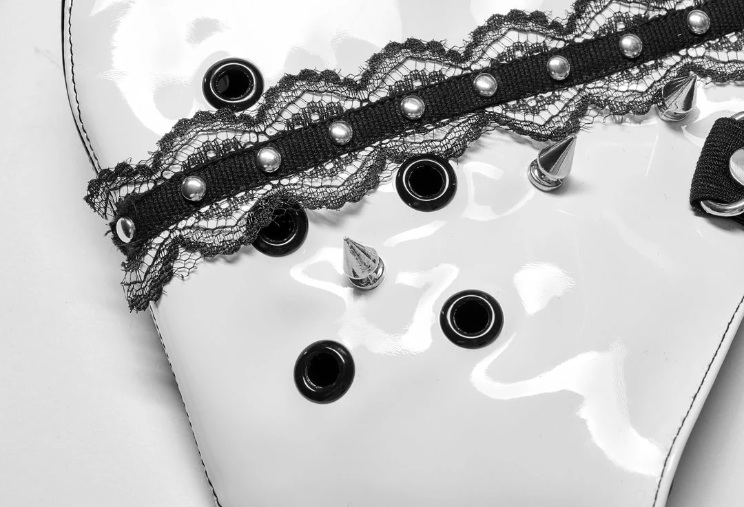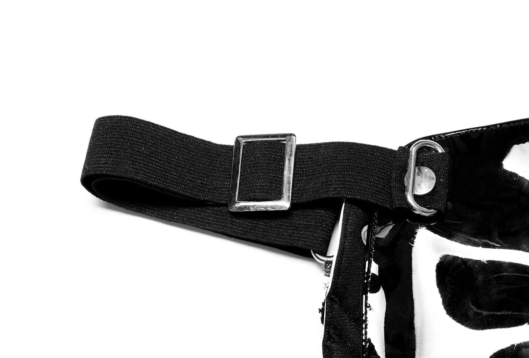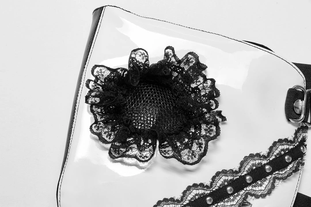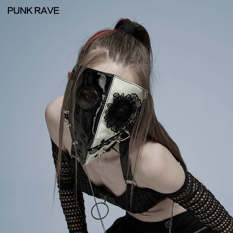 The dark Lolita face mask from Punk Rave. Black and white faux leather mask with lace decoration features an adjustable strap and ventilation holes for easy breathing.