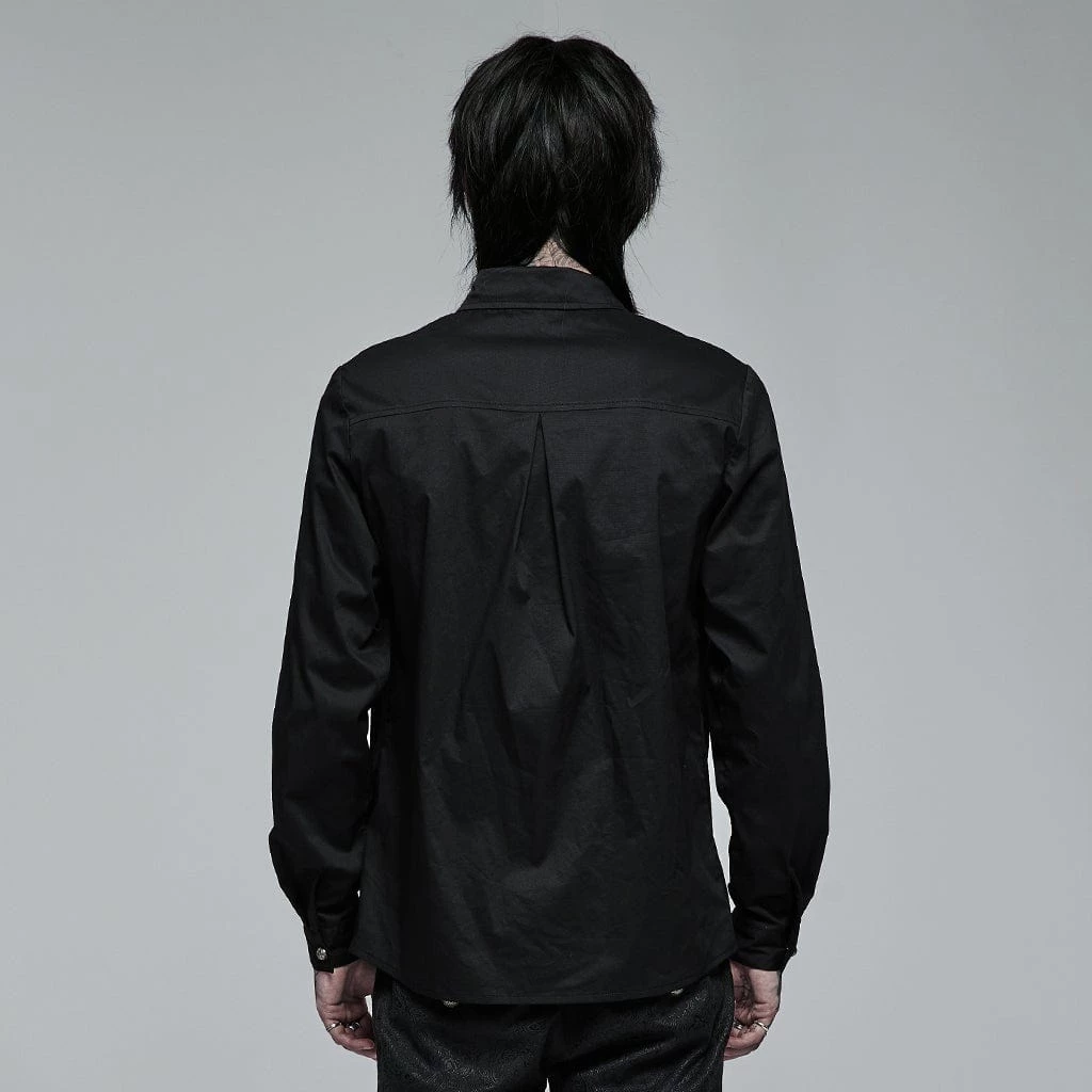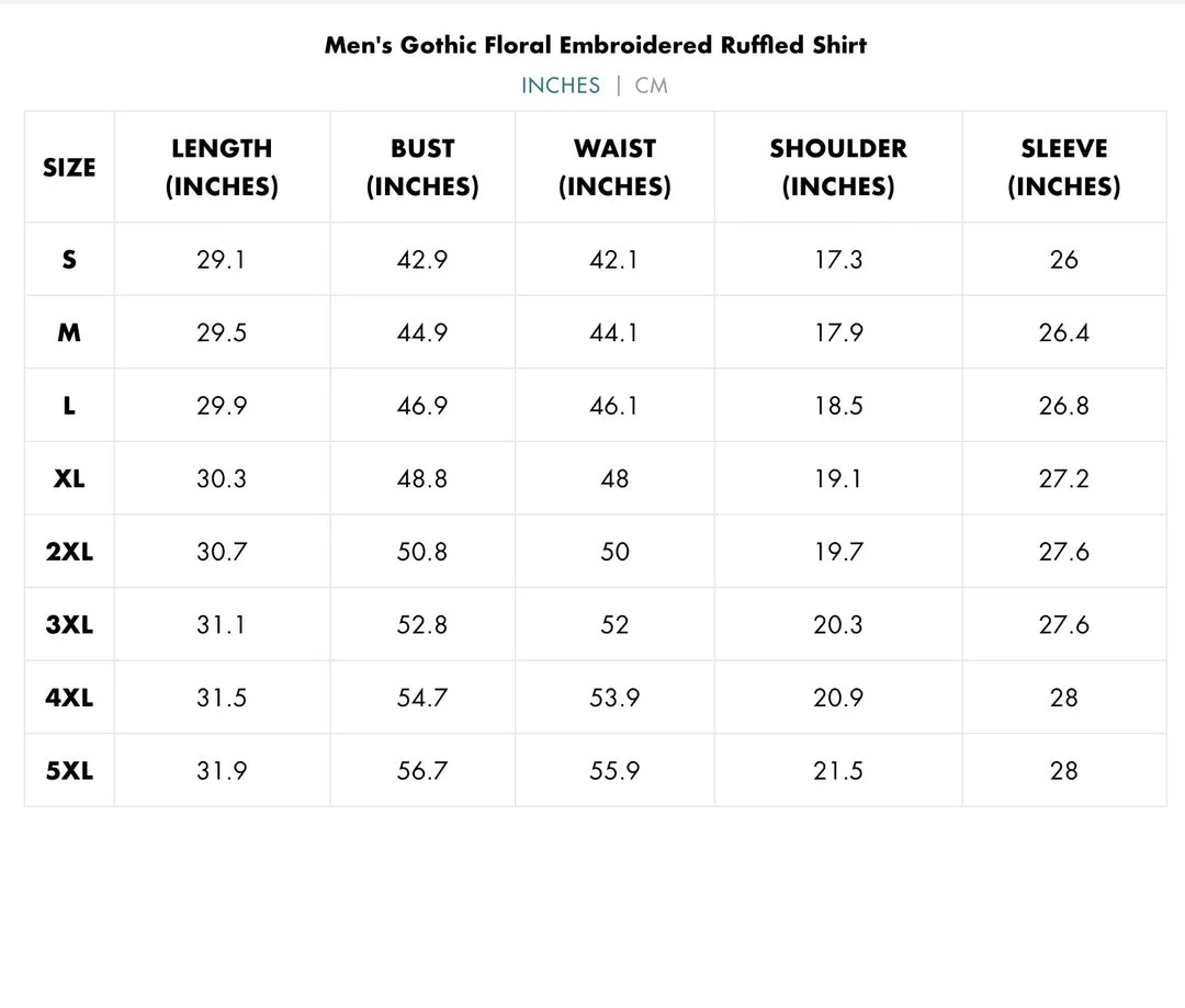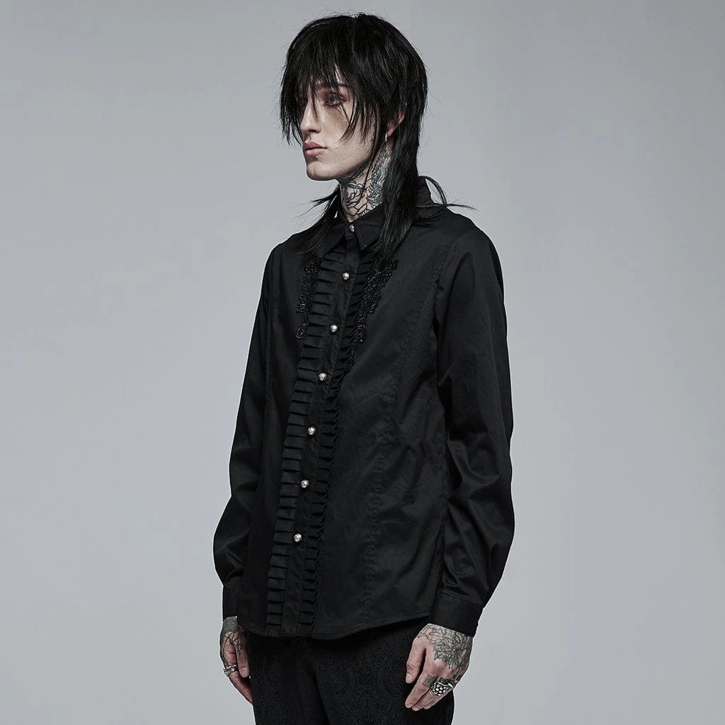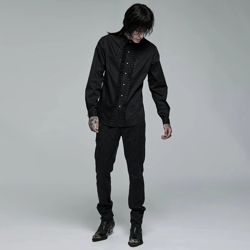 Black, long sleeve button-up shirt with ruffles and embroidered floral accects down the front.