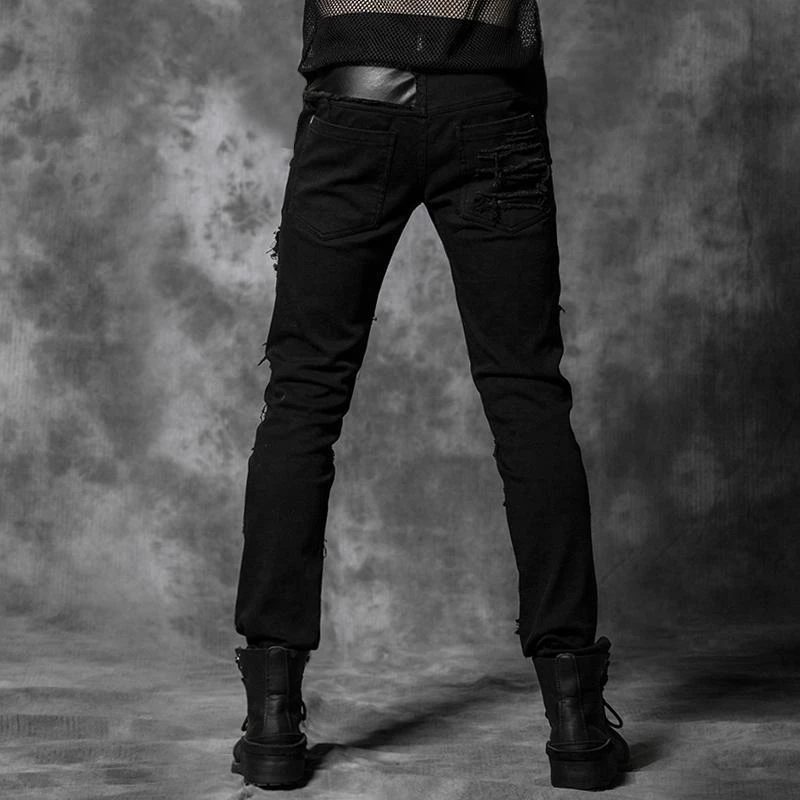 Fitted, black denim jeans with slashed legs and black pyramid studded denim patches on the knees. Jeans sit at the waist.
