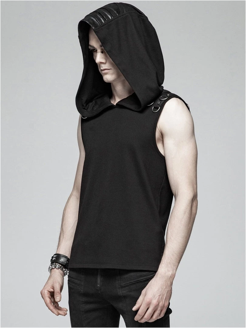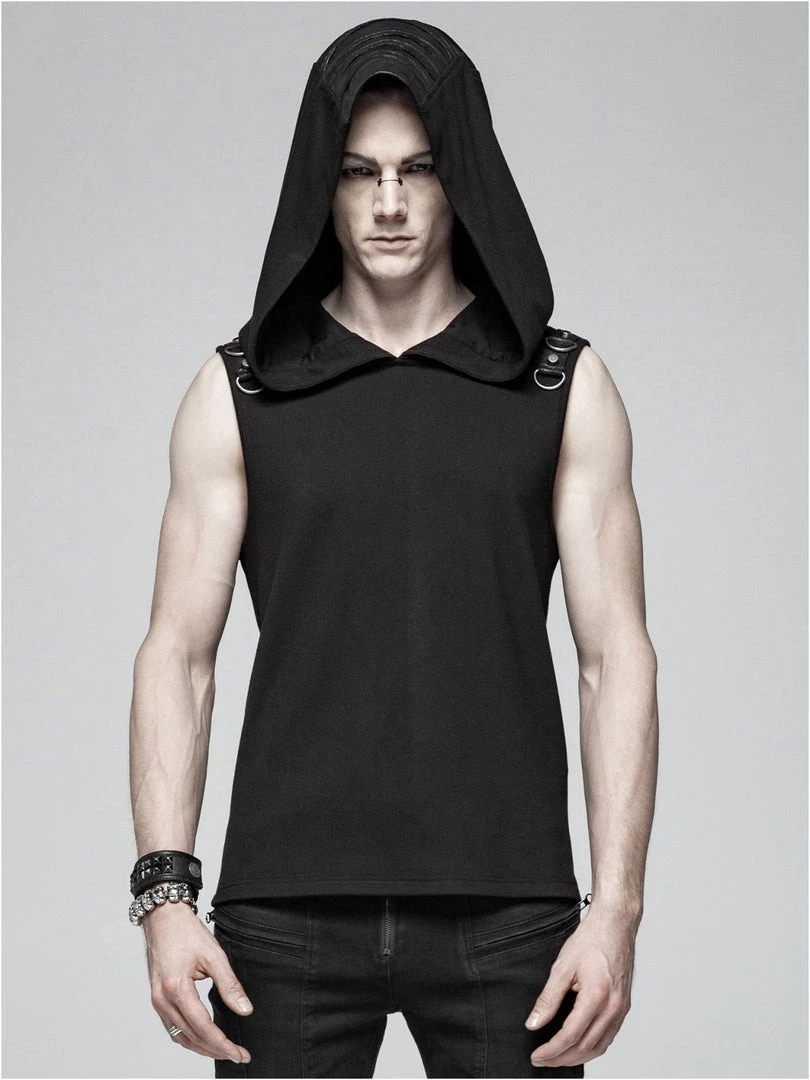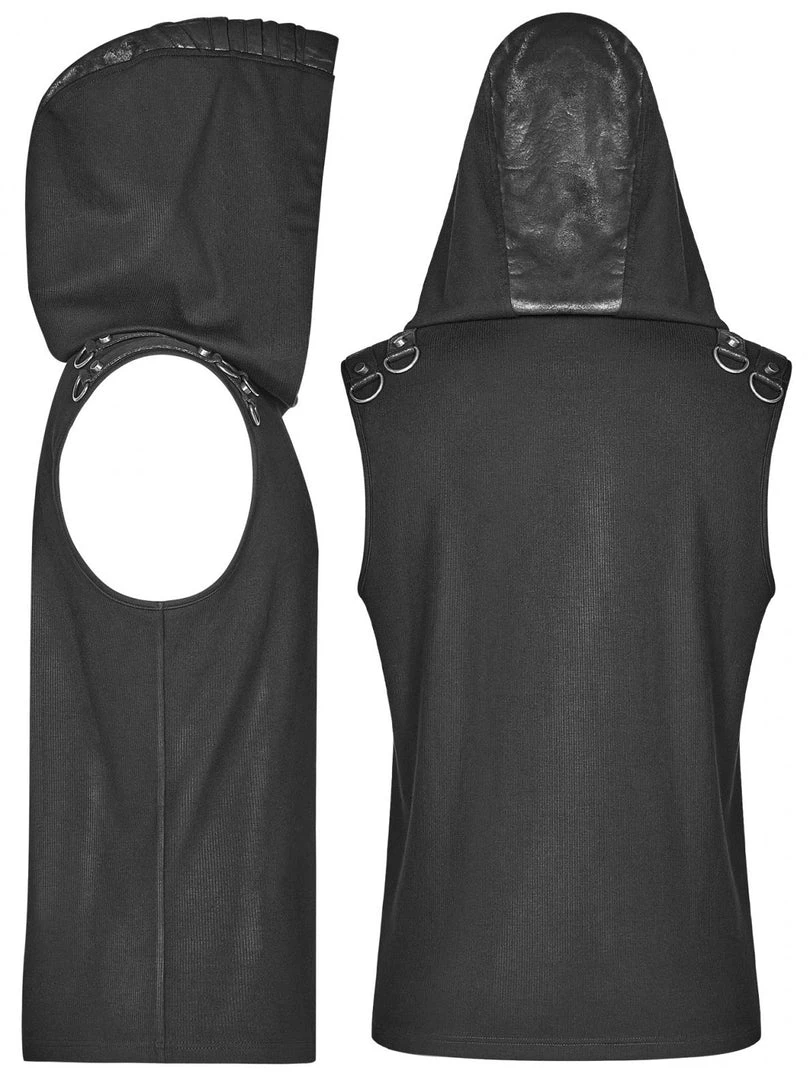Gothic Post-Apocalyptic style men’s black sleeveless hooded t-short decorated with synthetic vegan leather details and D-rings.