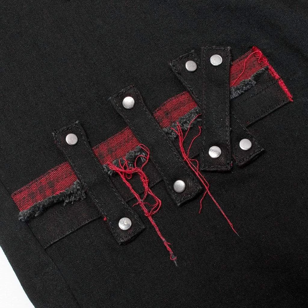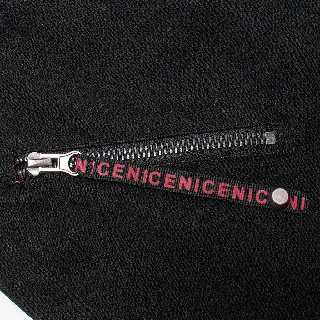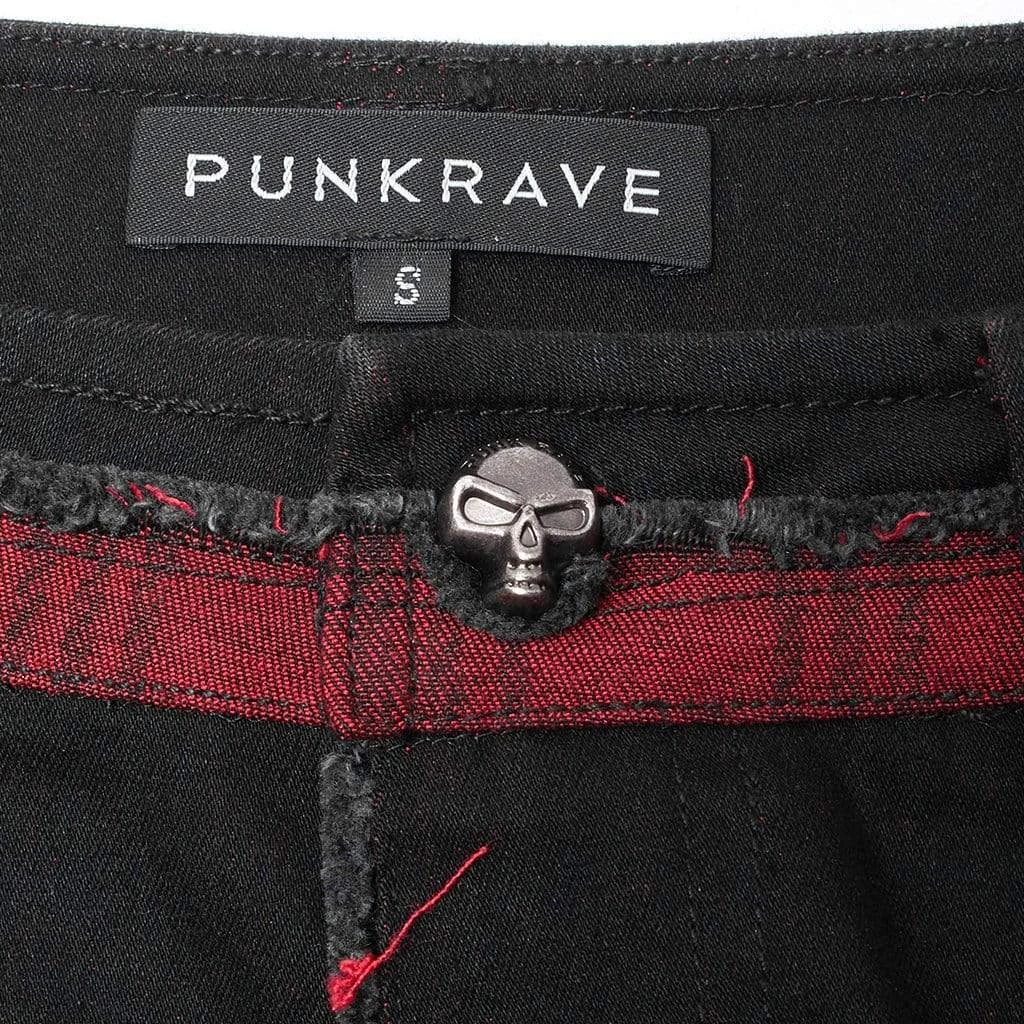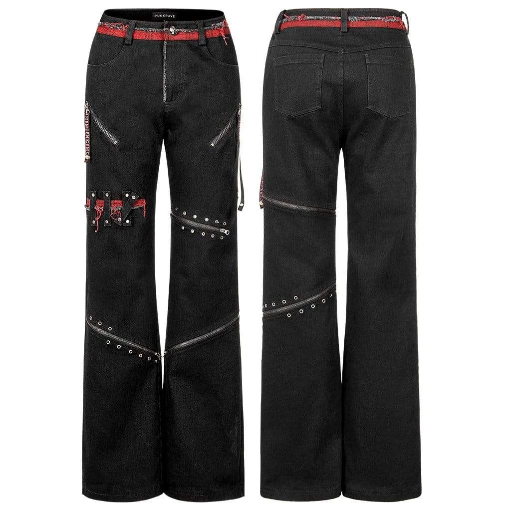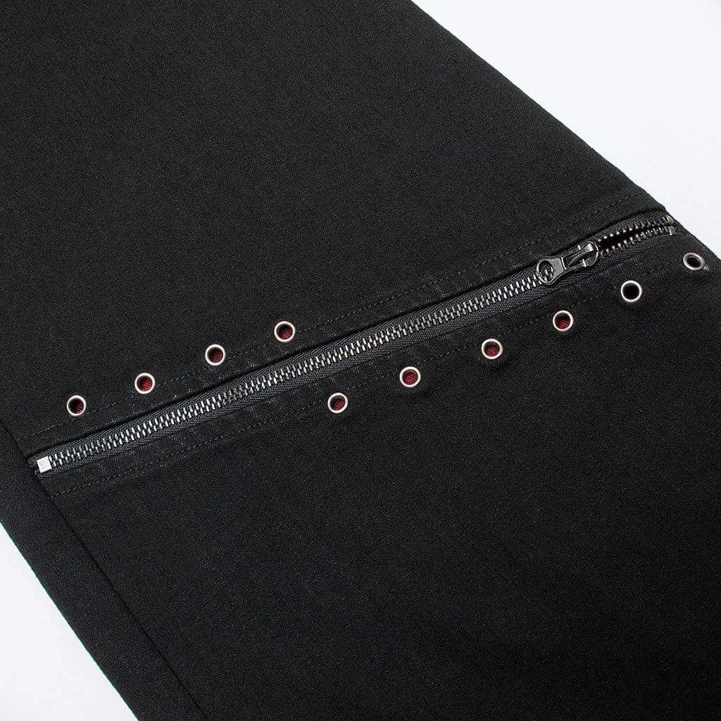Slim fit, black flared pants with grommets, working zipper accents, and a skull button.