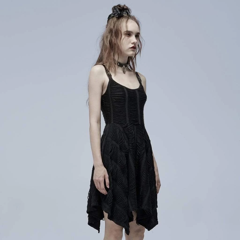 Vampire punk! Beautiful, asymmetric black slip dress. Stretchy knit draped fabric that falls in a web pattern with decorative buckles on the adjustable straps.