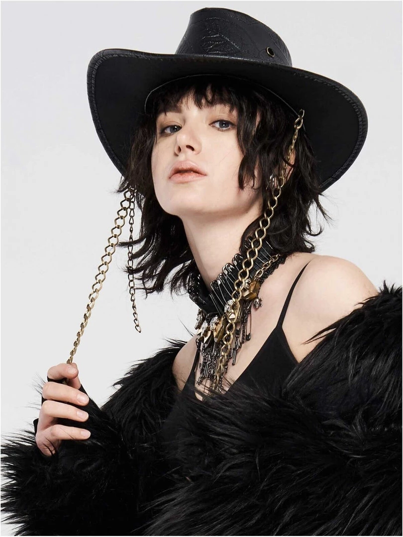 the Dawnrazor Hat (aka Steam-Rider Hat) is an iconic cowboy hat made of finely carved Pu leather. Braided band with beautiful antique gold metal buckle, antique gold metal chain neck straps and details.