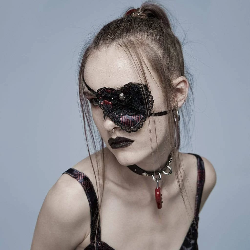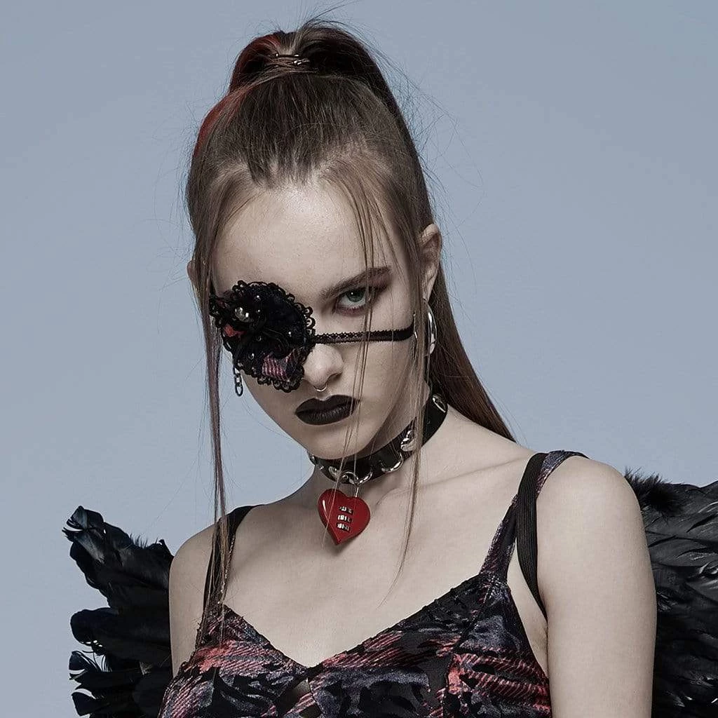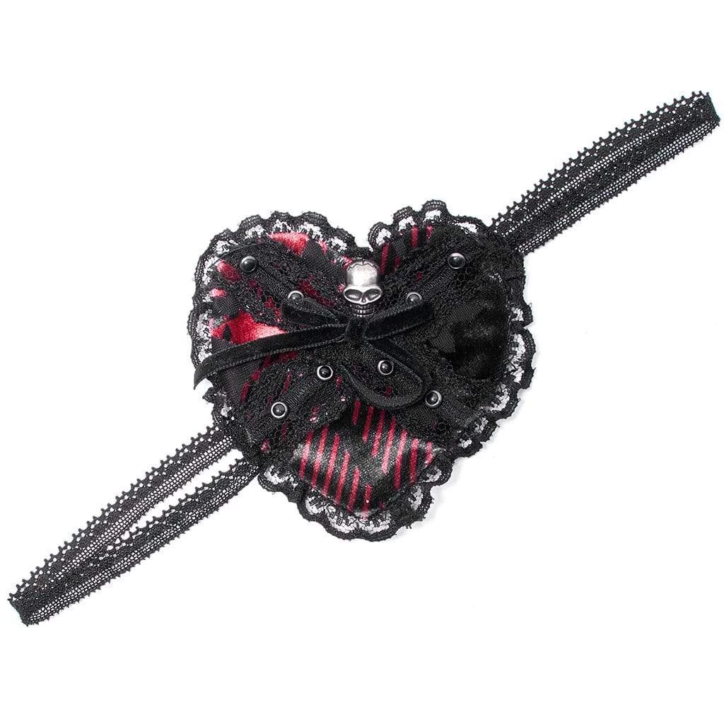 Black and red heart-shaped eye patch with black lace and metal skull.