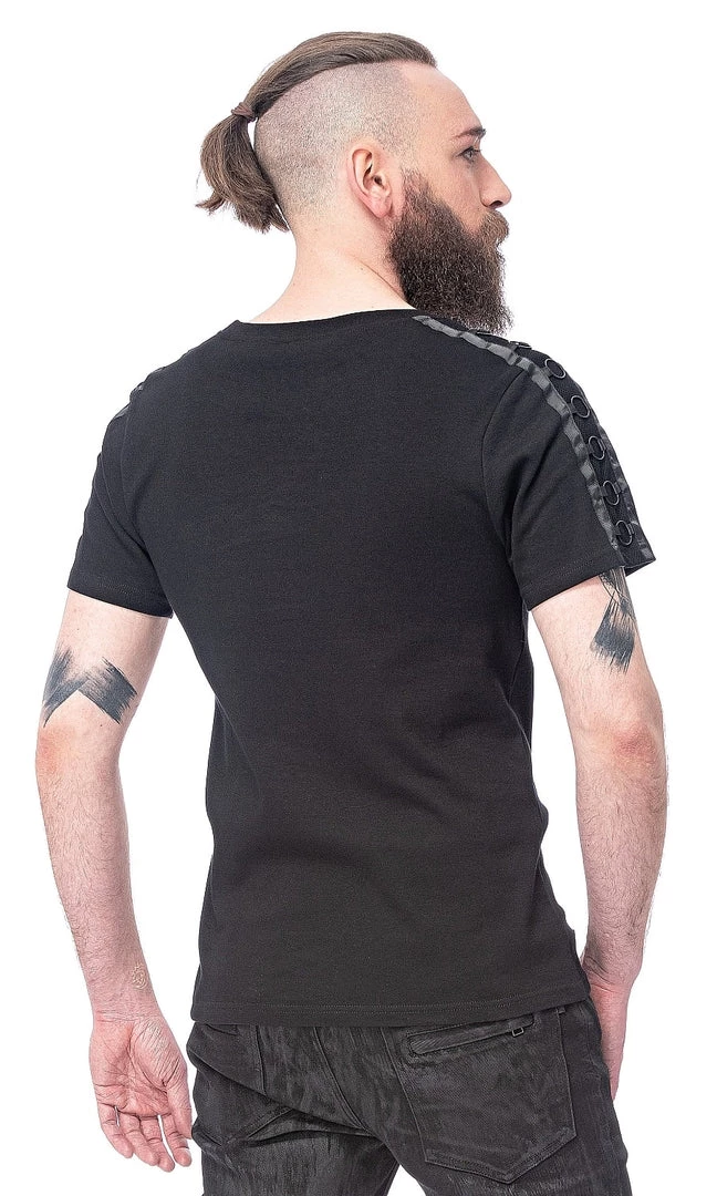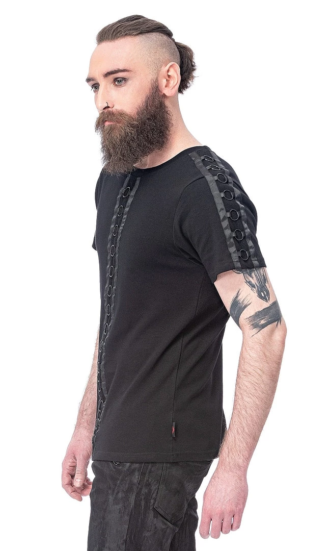 Gothic meets metal ! With this top you are well dressed, whether in the club, in everyday life or at the next concert ! The flexible cotton fabric makes it comfortable to wear in every situation. The visual highlights of the shirt are its decorations made up of a total of 34 black metal rings which can be found on the front and shoulders. These decorations are lined with a mesh fabric, which makes the shirt pleasantly airy. In addition, the shirt has a small metal plaque in the lower part with an EXTREME engraving. This shirt is just right for you ! · round neckline · decorations on the shoulders and on the front · 34 black rings · ornaments underlaid with a net · metal plaque with engraving