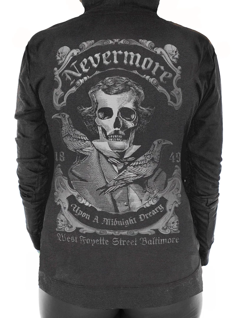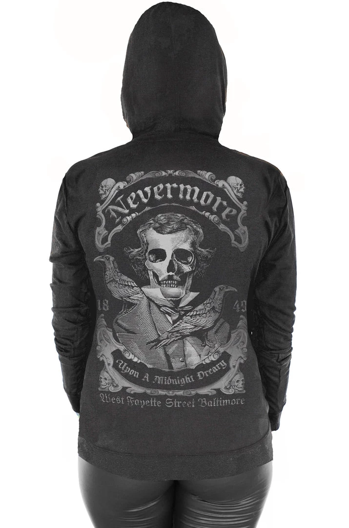 Nevermore Women’s Pull Zip Hoodie is a Grey on Black and features a Poe Inspired Art. A lighter slim fit Hoodie for comfortable year round wear.