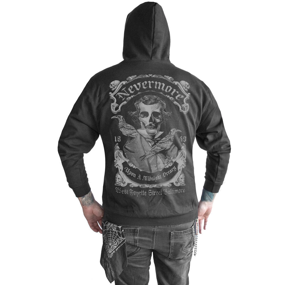 Nevermore Men’s Hoodie is a Pull Zip Hoodie is Grey on Black. Comfortable lightweight Fleece and a Contemporary fit. 100% Cotton and pre-shrunk.
