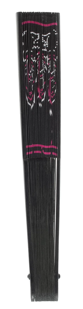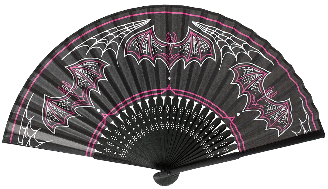 Our Batty Pinstripe hand fan is designed to bring you a little breeze and take you away to a pinstriped paradise. Even better, this little work of art folds accordion-style for ease of carrying, and unfolds to reveal an intricately pinstriped bat & web design, printed in pink & white on an all-black fan.