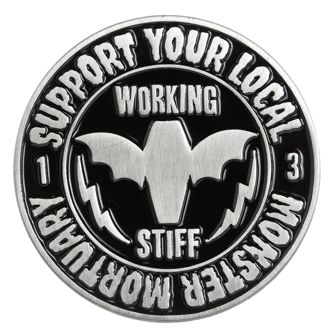 Support your local Workin’ Stiffs! By popular demand, we’ve taken our Monster Mortuary design and created a pin that’s excellent for taking anywhere that the living or dead may go. Just attach to your favorite jacket, vest or bag for a touch of that morgue life!