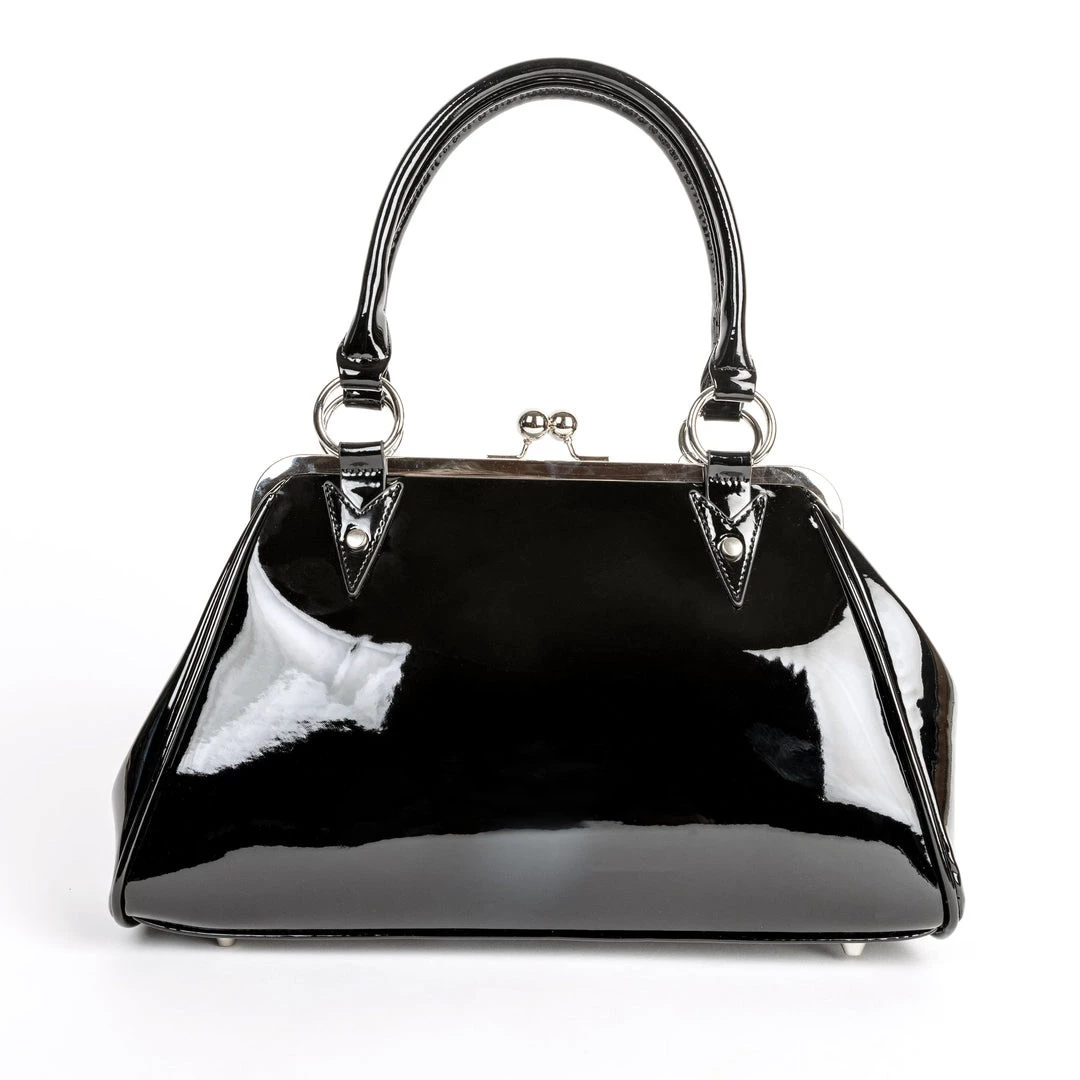Shock me, baby! Make a truly electrifying entrance with our newest Shock Me Handbag in a stunning black on black retro design. Crafted from a high quality, high gloss, black vinyl, this 1960s inspired silhouette is complimented by the front bolt design, black glitter vinyl accents, metal feet and silver Sourpuss brand hardware. The top closes shut with a kisslock closure, while the interior reveals a fun black and white striped lining complete with pockets.