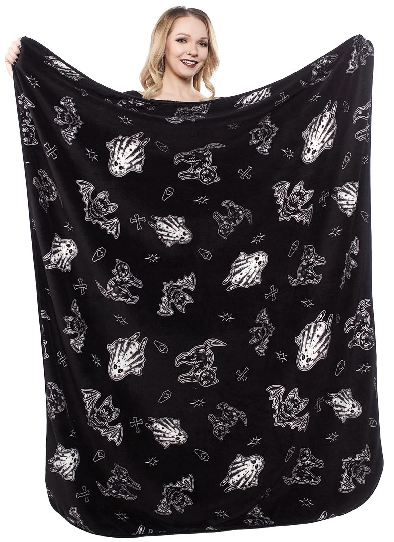 Booo! This blanket is all treats, no tricks – and so cute, it’s downright spooky! This unbelievably soft fleece blanket is the perfect size for snugglin’, featuring adorable lil’ ghosts, black kitties and bats, all dreamed by up Creep Heart. We think this fuzzy wonder will add the perfect spooky accent to your home year-round, so grab yours and get all wrapped up!