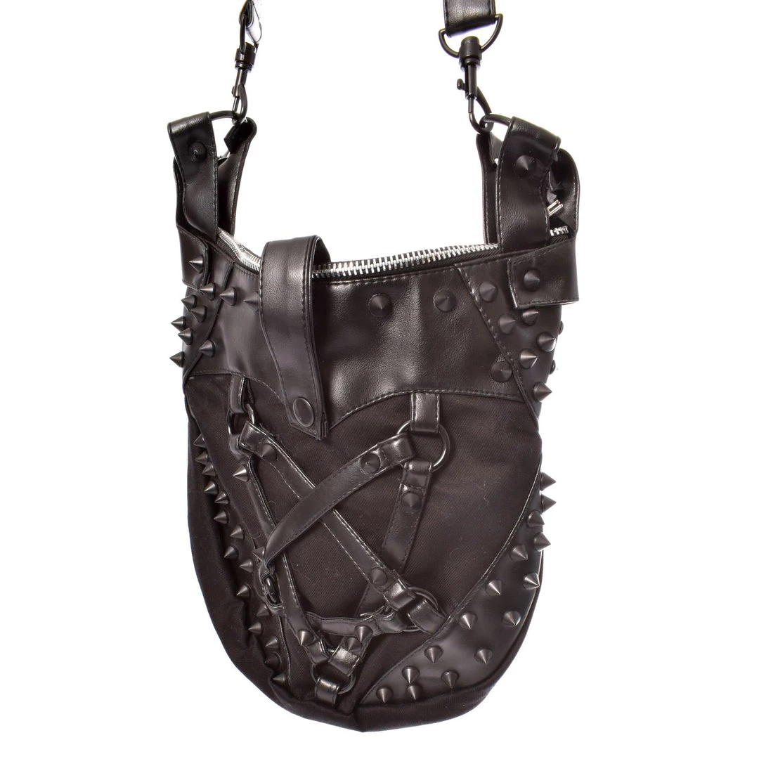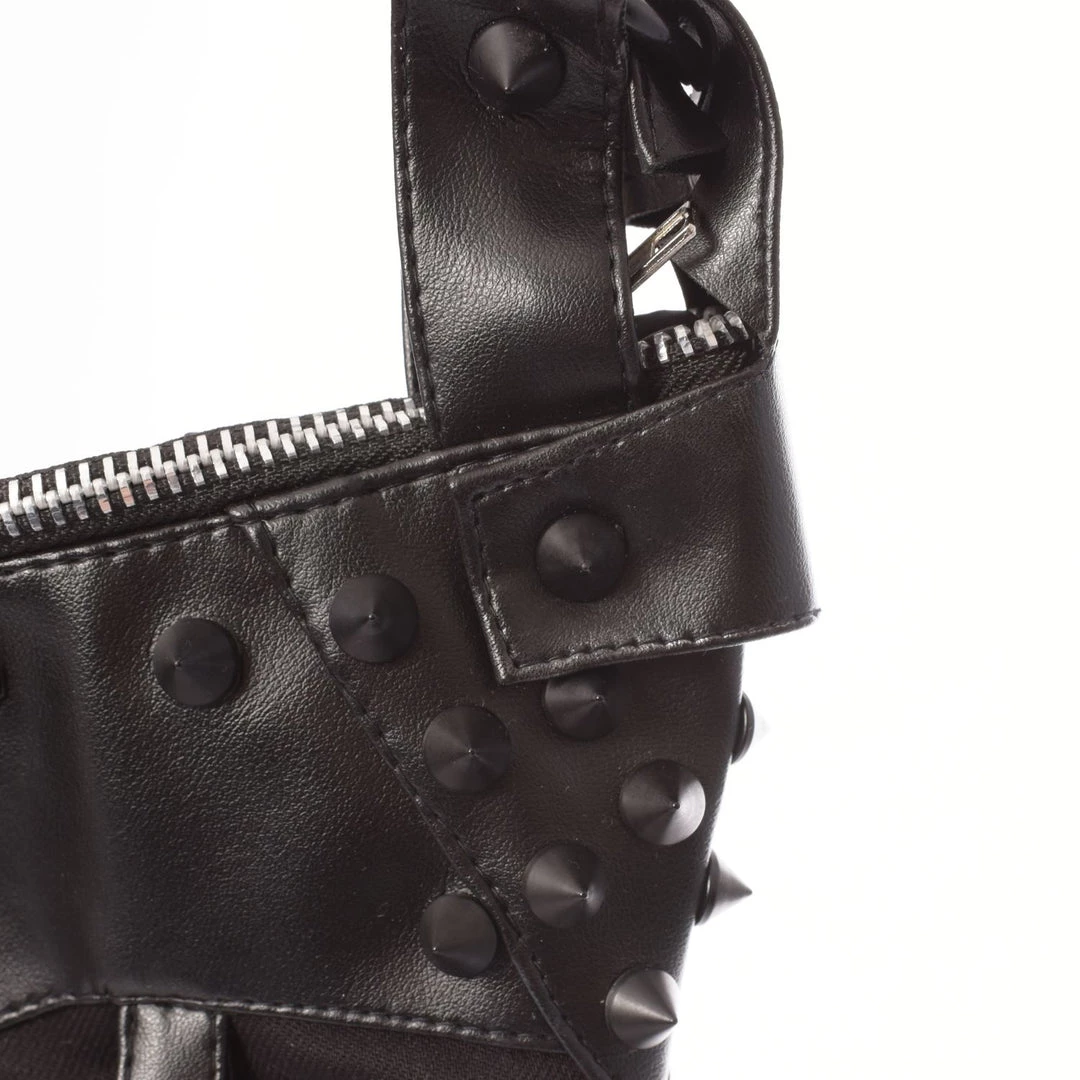 Black cross body bag with detachable studded shoulder strap and zipper closure. The main shoulder strap is adjustable and detachable, its length ranges from 31.5-45 in.